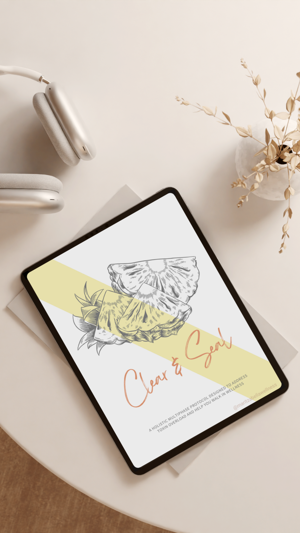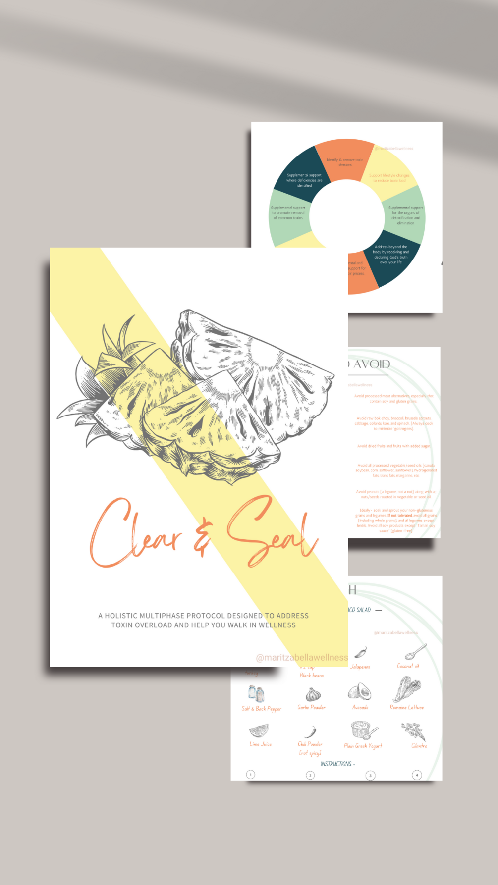 Introducing the 'Clear & Seal' Wellness Guide - your ultimate guide to achieving a toxin-free lifestyle. This 50 page 'Do it Yourself' guide offers a 5-6 month plan that includes recipes, supplement recommendations, direct links to recommended products, and a grocery list. The guide also features wellness educational content, Christian-based spiritual practices, and additional therapeutic practices and instructions to help you achieve optimal health and wellness. With the 'Clear & Seal' Wellness Guide, you'll be equipped with all the tools you need to detoxify your body, mind, and soul - and live your best life yet.